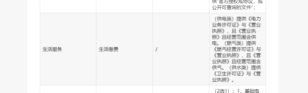 | 生活服务 | 生活缴费 | / | (供电类)提供《电力业务许可证》与《营业执照》,且《营业执照》且经营范围含供电。(燃气类)提供《燃气经营许可证》与《营业执照》,且《营业执照》且经营范围含供气。(供水类)提供《卫生许可证》与《营业执照》。(供热类)提供《供热经营许可证》与《营业执照》,且《营业执照》且经营范围含供热。 |