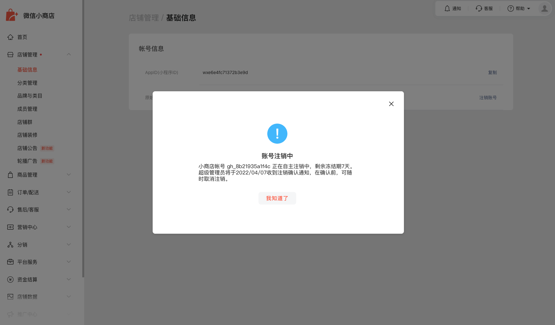 7天冻结期到期之后,超级管理员将收到注销通知。再次确认注销意愿,即可注销小商店。