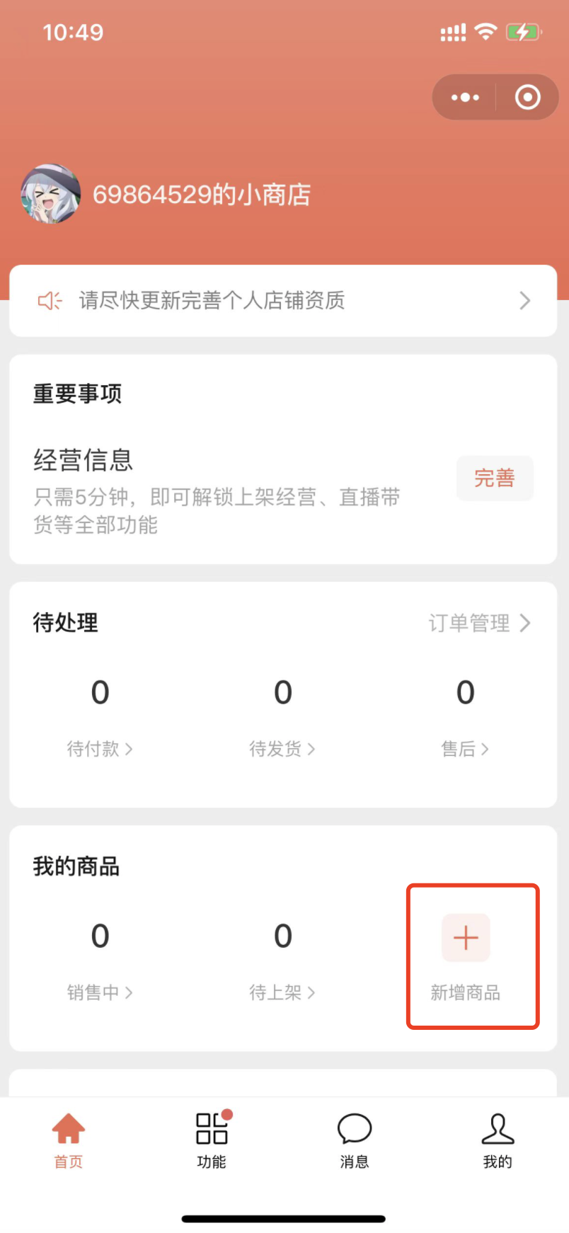 1、在小商店助手的首页选择“新增商品”后,进入新增商品页