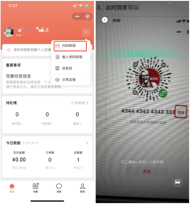 4、商家可以打开小商店助手,在右上角找到“+”号,选择扫码核销之后进行核销