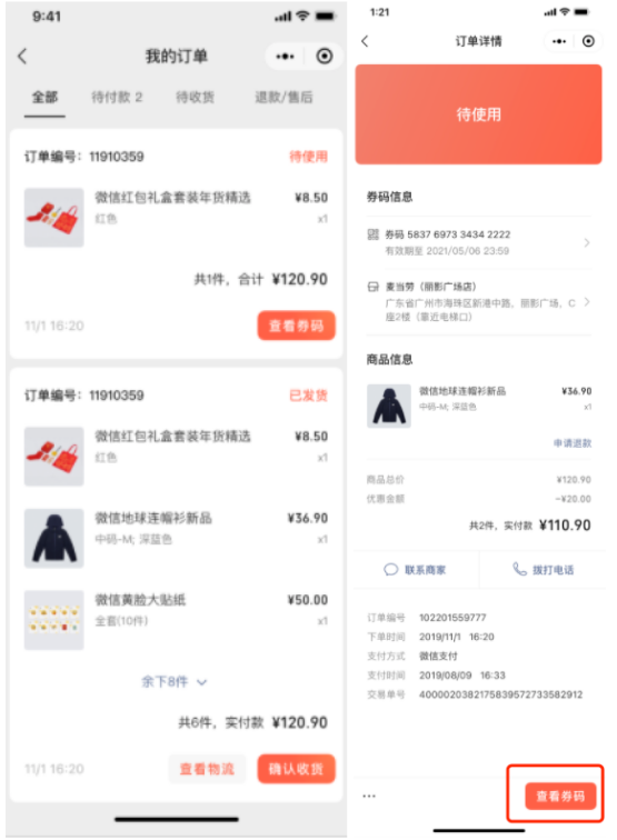3、用户可以直接在手机上出示二维码、复制券码、或者将二维码截图发给商家