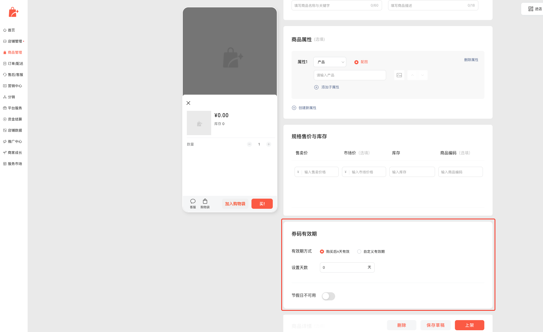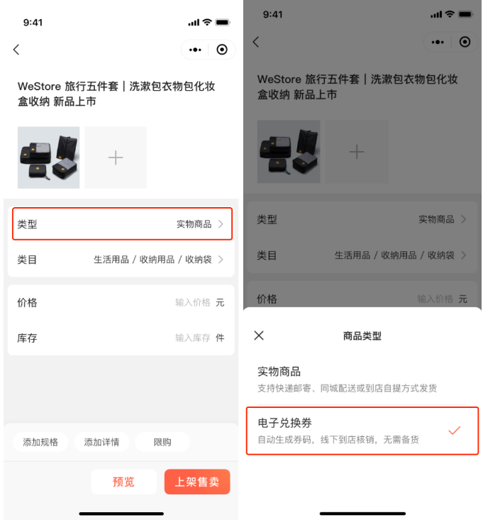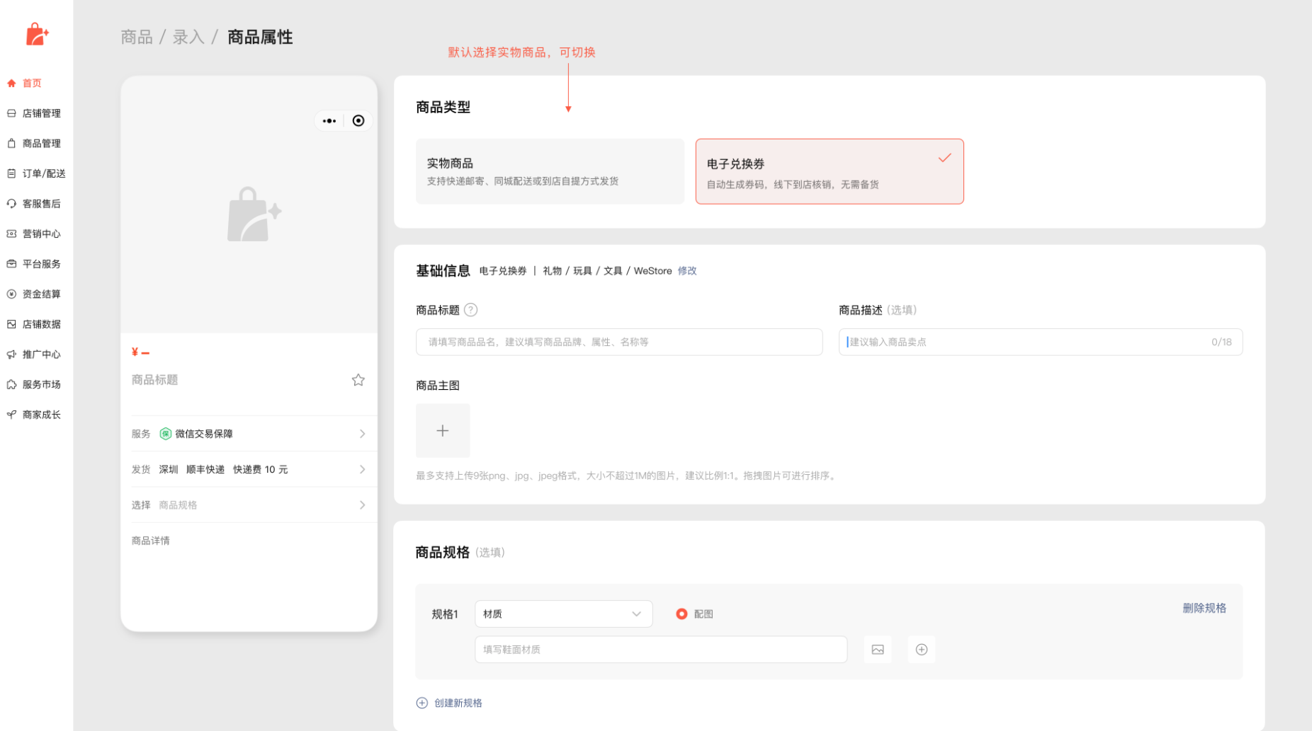 2、在新增商品页选择“类型”,可以切换商品类型至电子兑换券