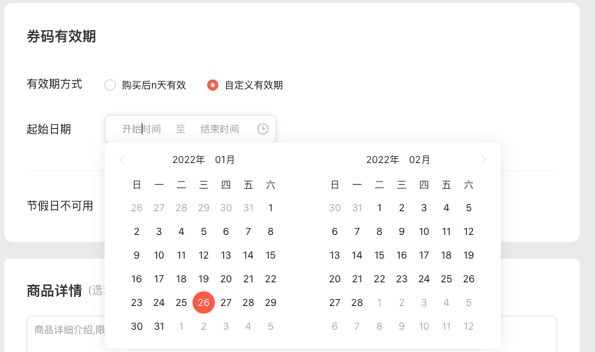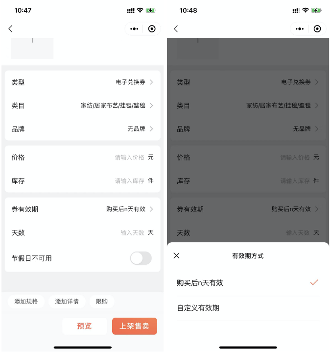 3、设置兑换券的有效期,可以选择“购买后n天有效”或者“自定义有效期”