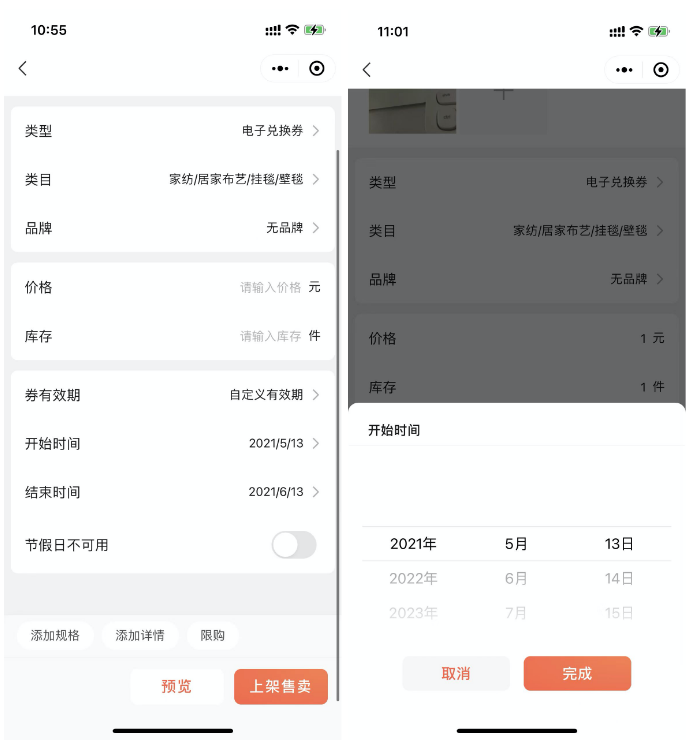 在小商店助手小程序和小商店电脑端后台均支持创建电子兑换券商品