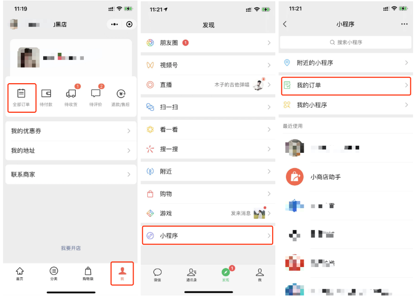 路径二:微信发现页,点击“小程序“,点击“我的订单”