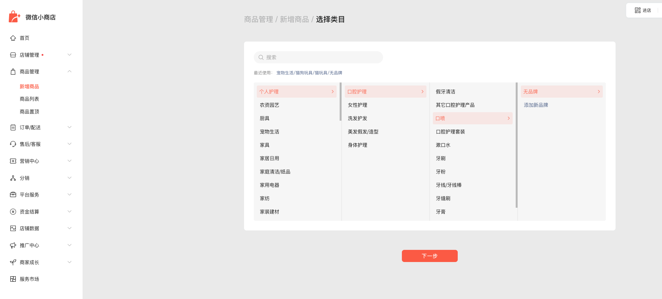 1、登录进小商店电脑端之后,前往商品管理-新增商品-选择商品类目