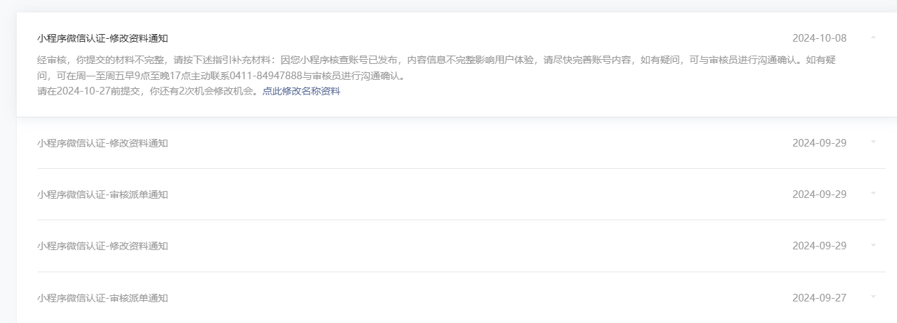 今年进行小程序年审,第一填了资料被驳回,电话通知我小程序有问题,处理之后,第二次提交审核又被驳回。登录小程序管理后台查看被驳回原因,结果只提示要重新填写,详细原因根本没有用,于是第二天上午根据提示的联系电话打给审核公司,审核公司说客服坐席忙,稍后会给我回电话,结果一直到十一放假也没给我打电话。假期结束我有联系审核公司,依旧上一次联系的说辞,我又等了一天依旧无人联系,于是我又打过去电话,这次给了我一个QQ,我加了发了审核信息和咨询的问题,依旧说已通知审核员,让我等电话,等了一天没等到,又QQ联系,这次没回我,第二天才回复我,还是让我等电话,依旧没等到。所以我想投诉这家审核公司,结果找不到投诉或者联系小程序官方的入口,所以发帖来请教大家。