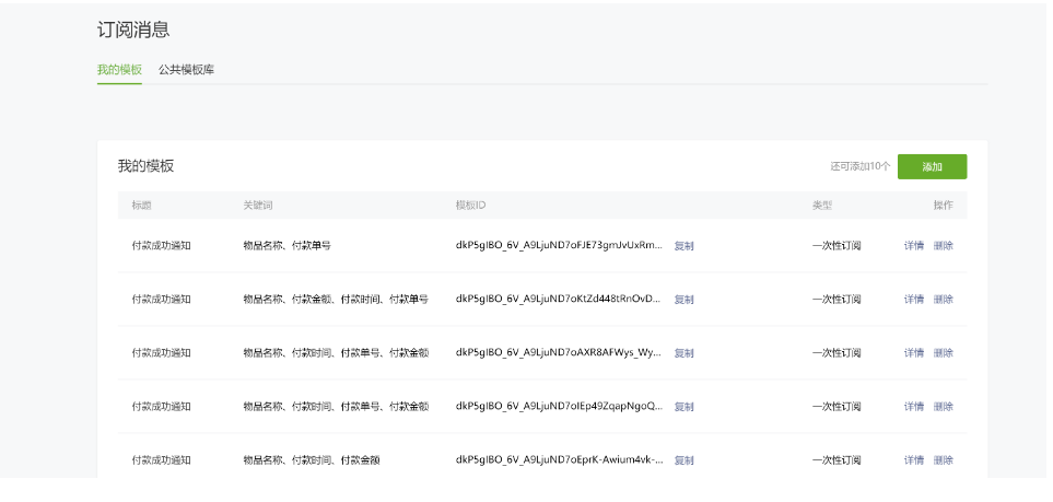 答:进入MP后台,https://mp.weixin.qq.com, 可以在【功能】->【订阅消息】->【公共模板库】选择合适的模版。选择后在【我的模版】 查看到模版ID。