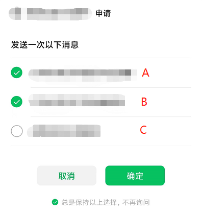答: 如果选择了【取消】+ 【保持选项】,所有订阅消息次数都不会再增加。如上图,不管是否勾选,A、B、C三个模版次数都不会增加。