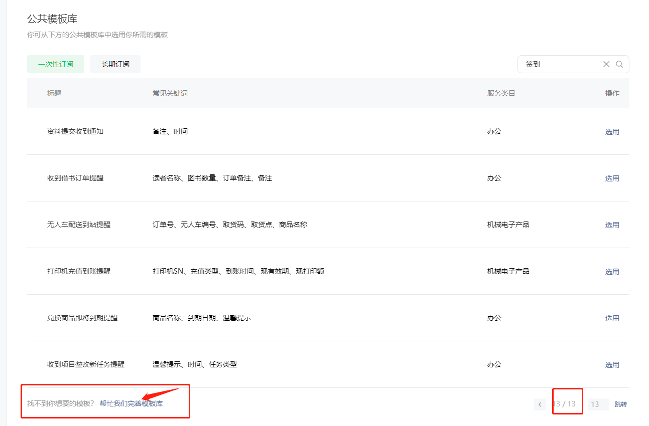 答:在MP后台申请,入口比较隐蔽。如要在【公共模版库】搜索任意模版,然后翻到最后一页,会出现【帮助我们完善模板库】的选项,点击进入申请新模版。比如此处我搜索了签到