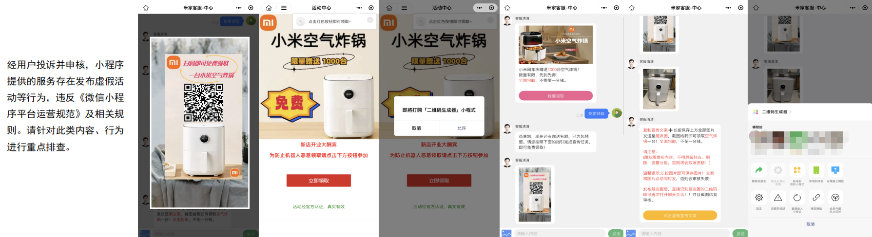 突然收到消息,小程序违反规范,被永久封禁。我们作为一个二维码生成的工具,投诉信息全是小米空气炸锅的领取。一个工具类的哪来的做免费领取的任务活动,我们按照屏蔽规则提交了跳转拦截,禁止分享,给出人工审核。提交申诉都是一样的回复,我们一百多万的用户在使用,突然封停。