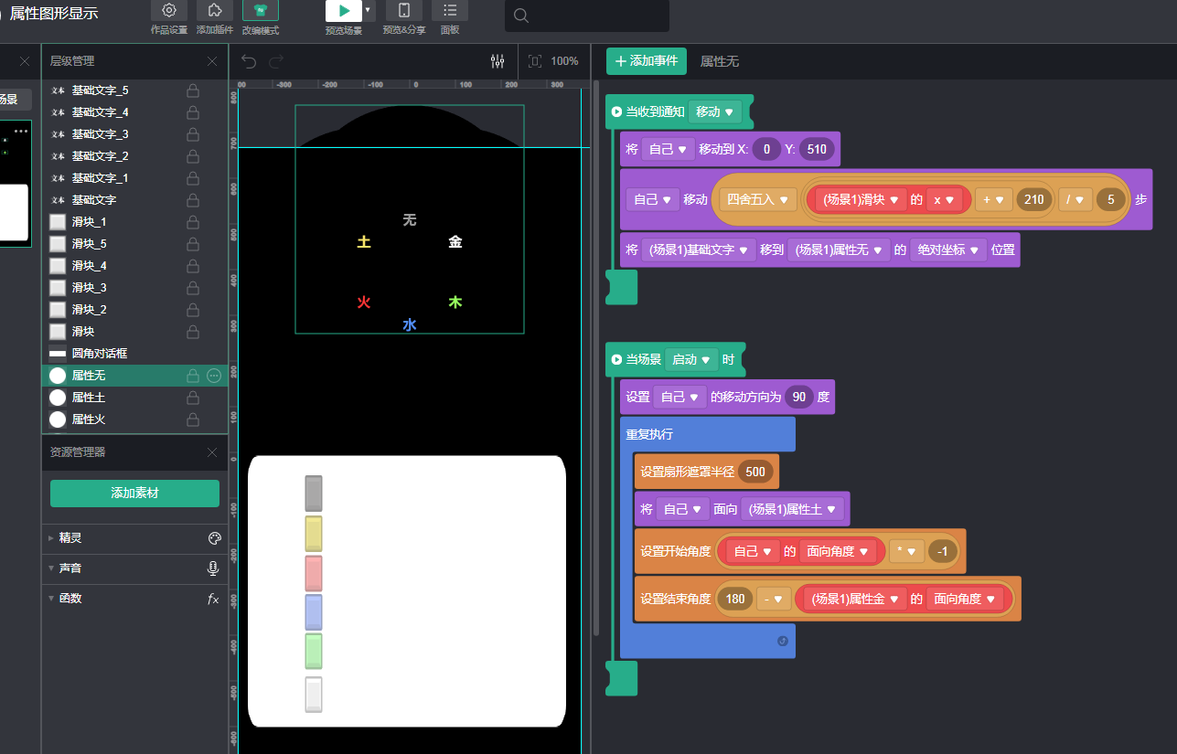 如上图,六个圆球有各自扇形遮罩的空白处,再加块底色图即可,代码积木方面依照顺序、这六个东西循环衔接就差不多了。