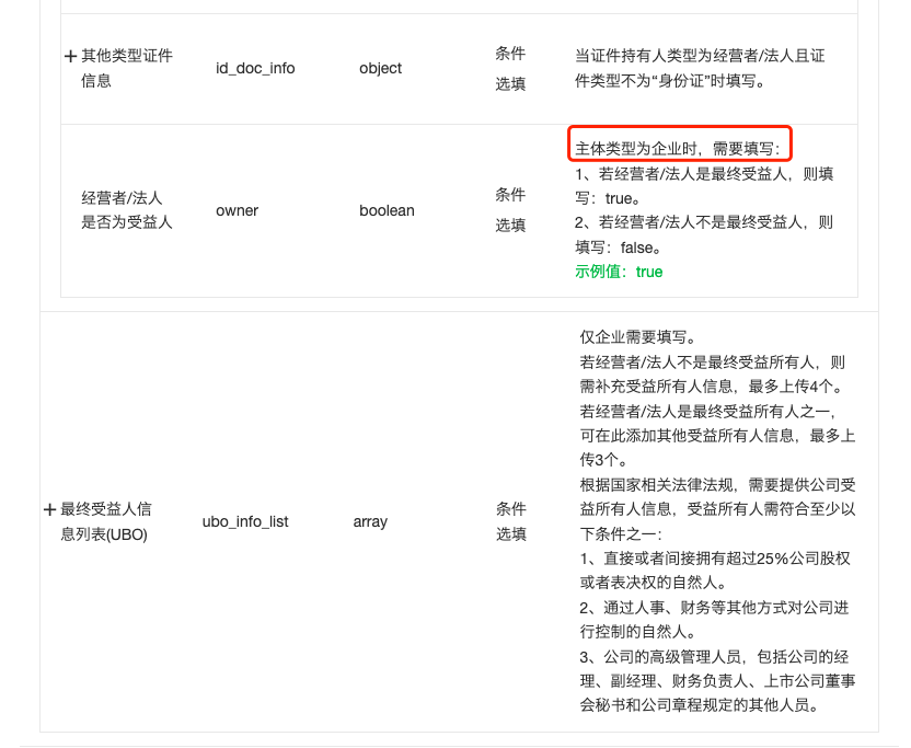 我刚调试完,个体工商户,不能传 owner 字段,要不然会报:请重新确认最终受益人相关字段 的错误。只有主体类型为企业时,才可以填写。