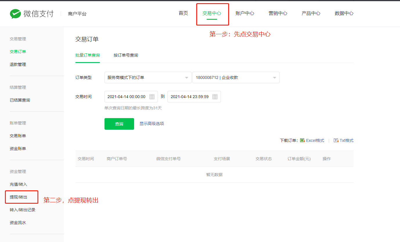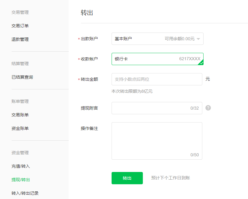 电脑端操作:登陆微信支付平台(https://pay.weixin.qq.com),管理员扫码登陆,登陆以后先点【交易中心】,再点左下角的【提现/转出】,输入提现金额继续操作即可