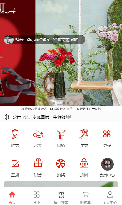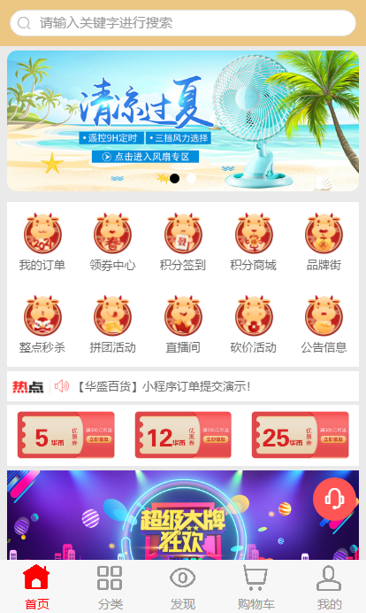 小程序包含首页、购物车、我的、分类几大类,首页顶部轮播图、推荐商品、促销活动等;接下来可以展示活动例如整点秒杀、限时抢购、拼团、砍价、优惠券等;最后可以展示商品或预约门店、地图导航、客服等。