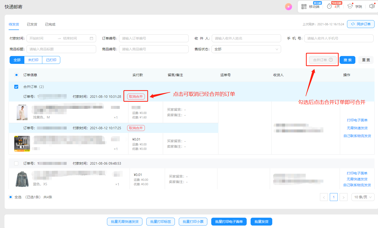 完全相同收件信息的多笔订单支持合并后打印电子面单,勾选订单后,点击【合并订单】,即可合单进行打印面单操作
