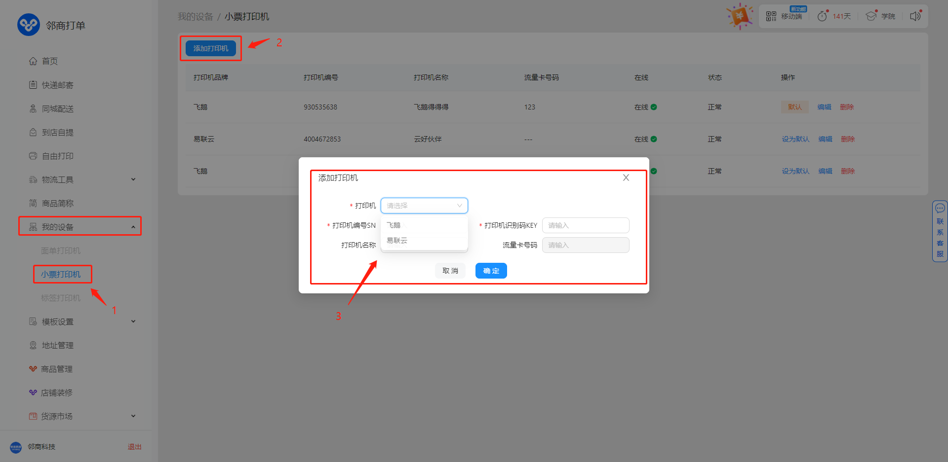 如需打印小票,可以点击【我的设备】-【小票打印机】,点击【添加打印机】进行打印机绑定,目前仅支持【飞鹅】及【易联云】小票打印机,支持自定义设置【打印机名称】,支持设置【默认打印机】