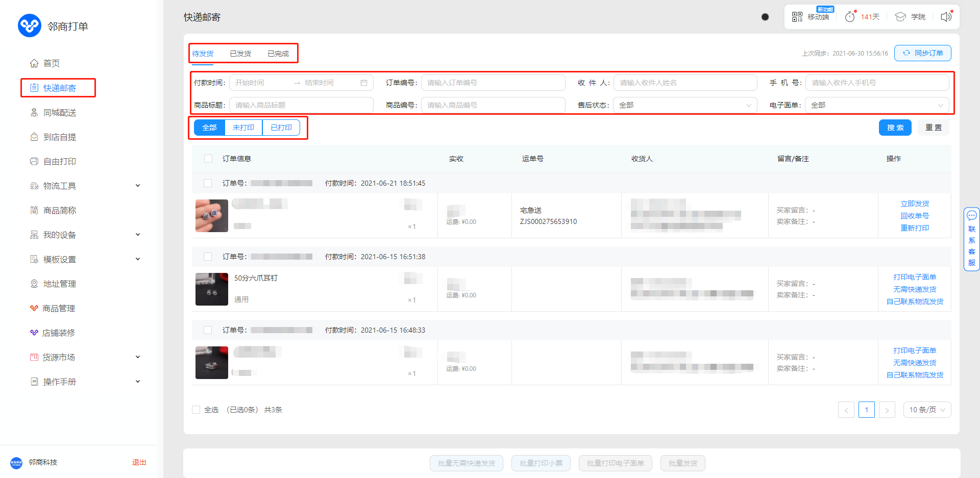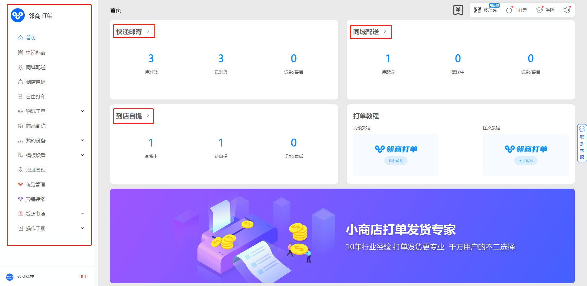邻商打单首页分为【左侧菜单栏】,订单展示页面分别为【快递邮寄】、【同城配送】及【到店自提】三种,点击即可跳转到对应订单列表