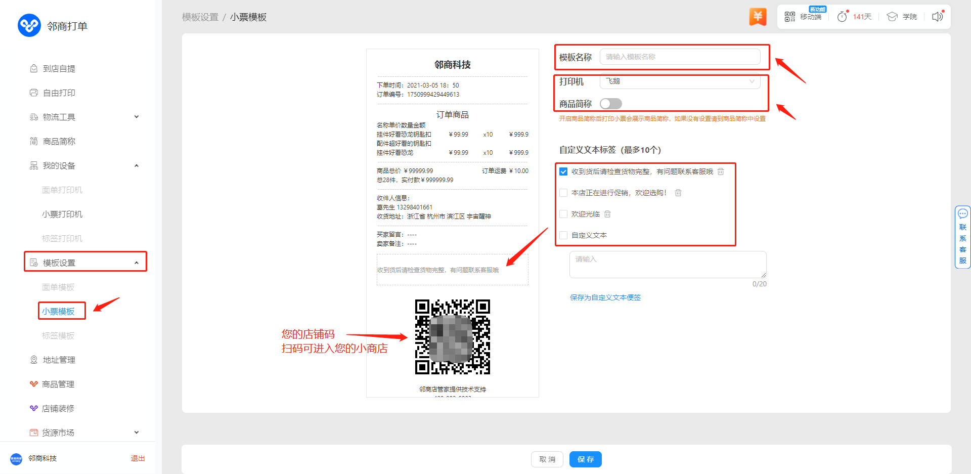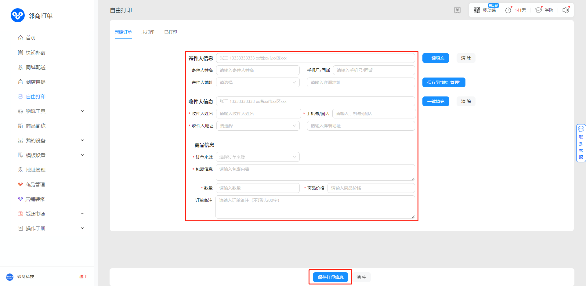 点击【自由打印】,进入【新建订单】页面,输入相关订单信息后,点击【保存打印信息】,即可保存该订单。