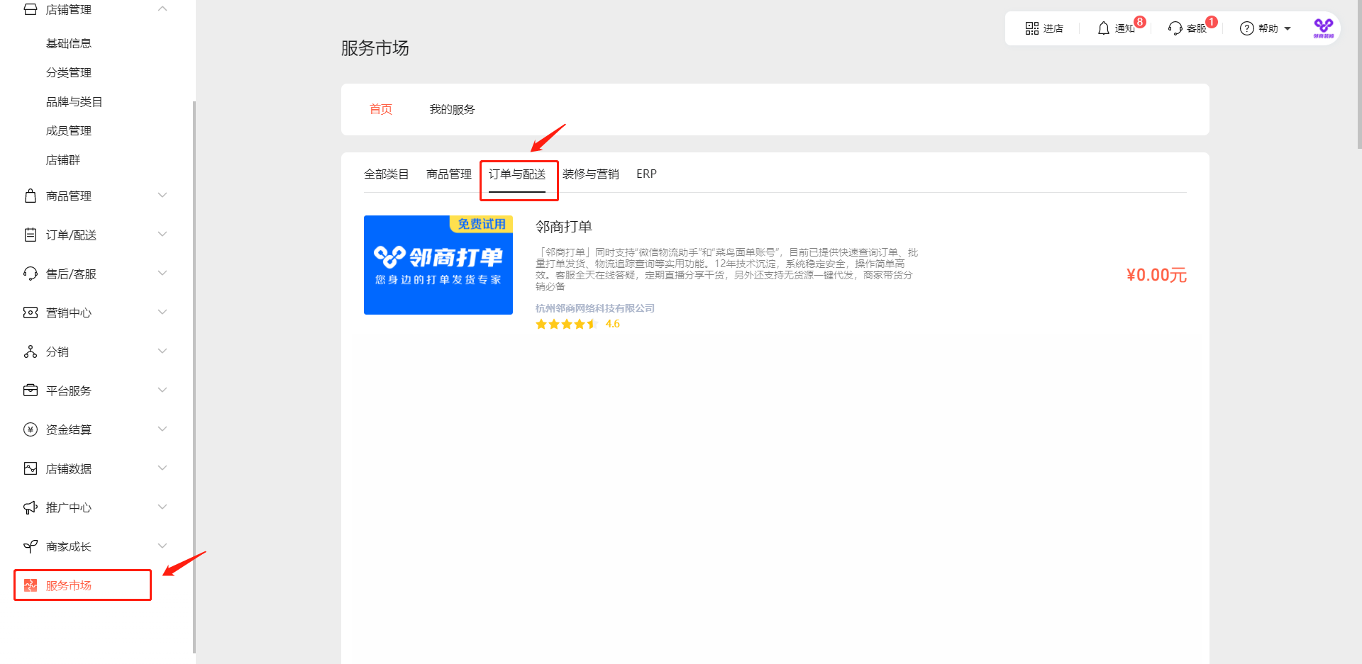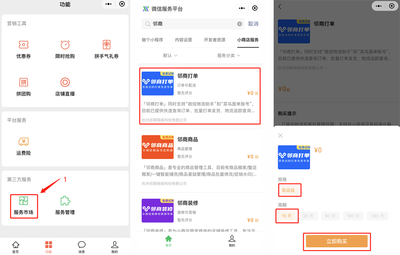手机端搜索【小商店助手】,进入【服务市场】,搜索【邻商】,选择【邻商打单】进行15天免费订购