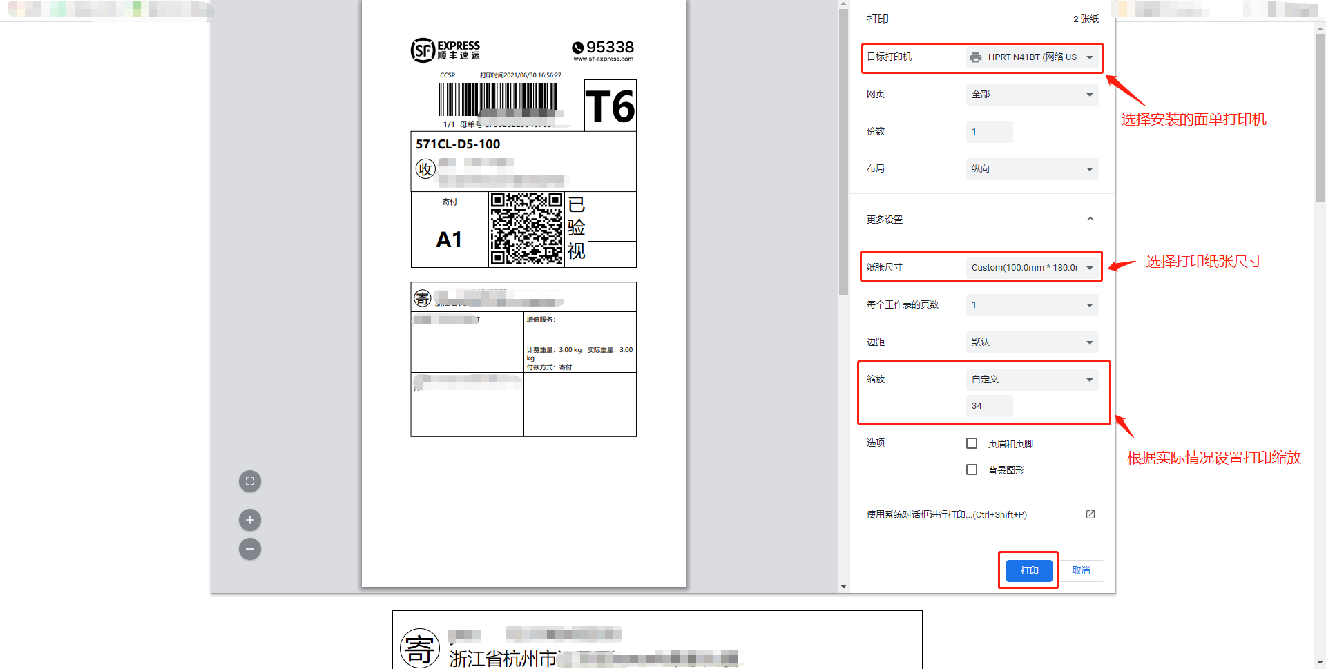 点击【打印电子面单】后,可以进行面单预览,同时选择打印机,打印纸张尺寸、缩放比例、布局等等,调整完成后点击【打印】即可打印面单