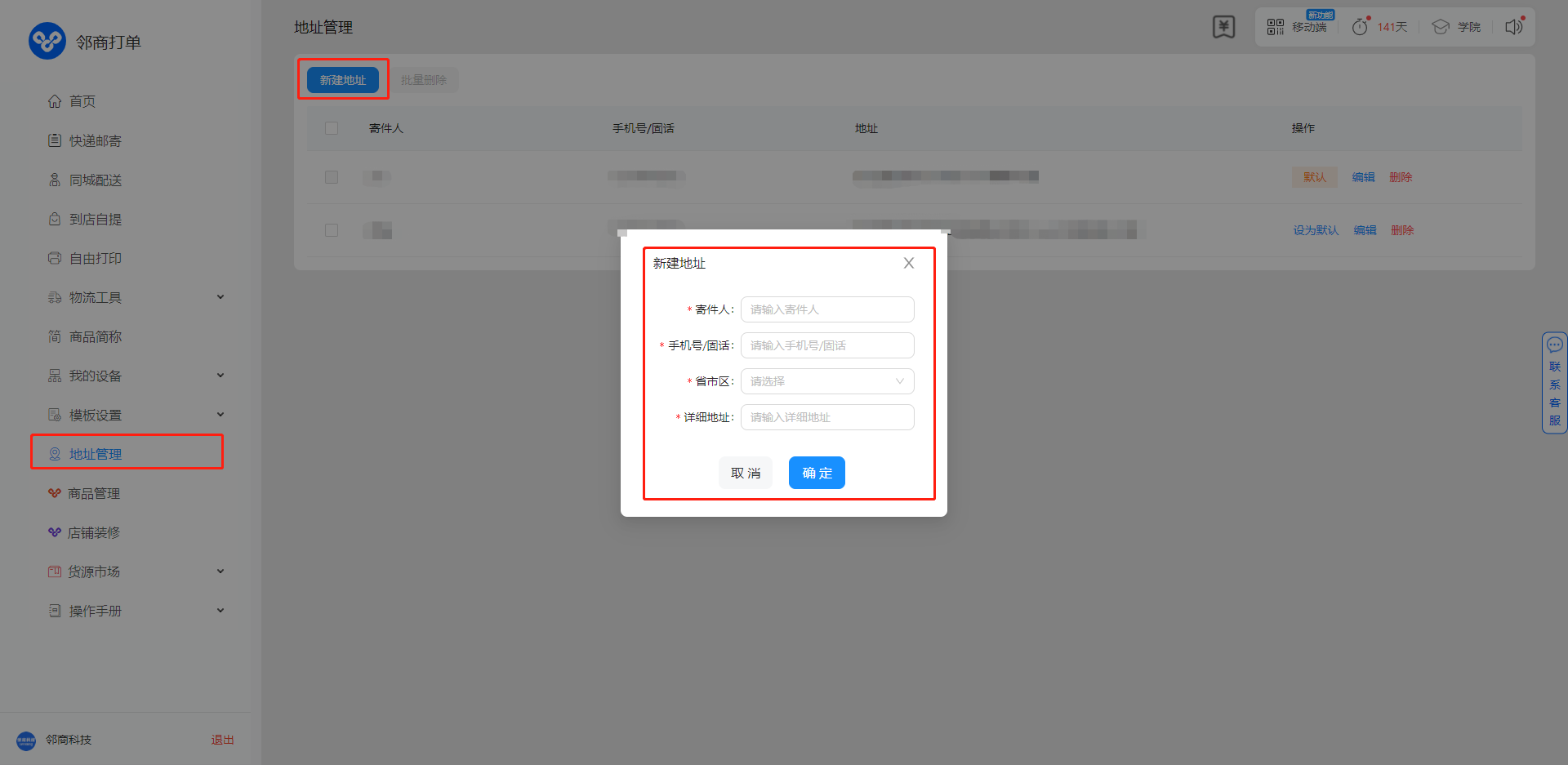 在 2.1 快递面单账号绑定操作时,您已经输入了电子面单开通地址,改地址会同步到【地址管理】列表中,您可以使用改地址,也可以点击【地址管理】-【新建地址】,进行发货地址设置,也可以自定义默认地址