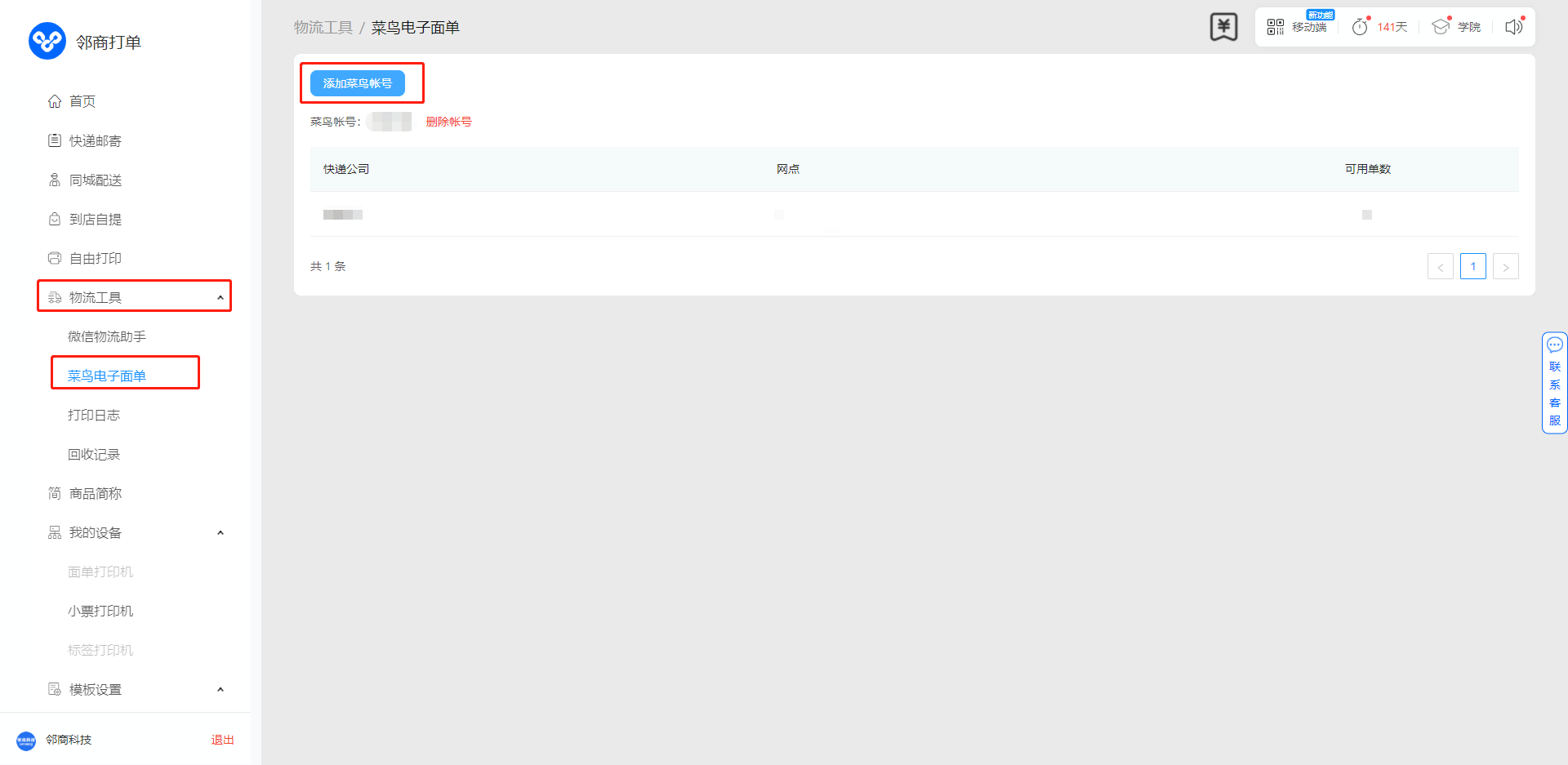 如您已经开通了菜鸟电子面单,并且已经有合作充值的快递账号,可以点击【菜鸟电子面单】-【添加菜鸟账号】,绑定已有的菜鸟账号