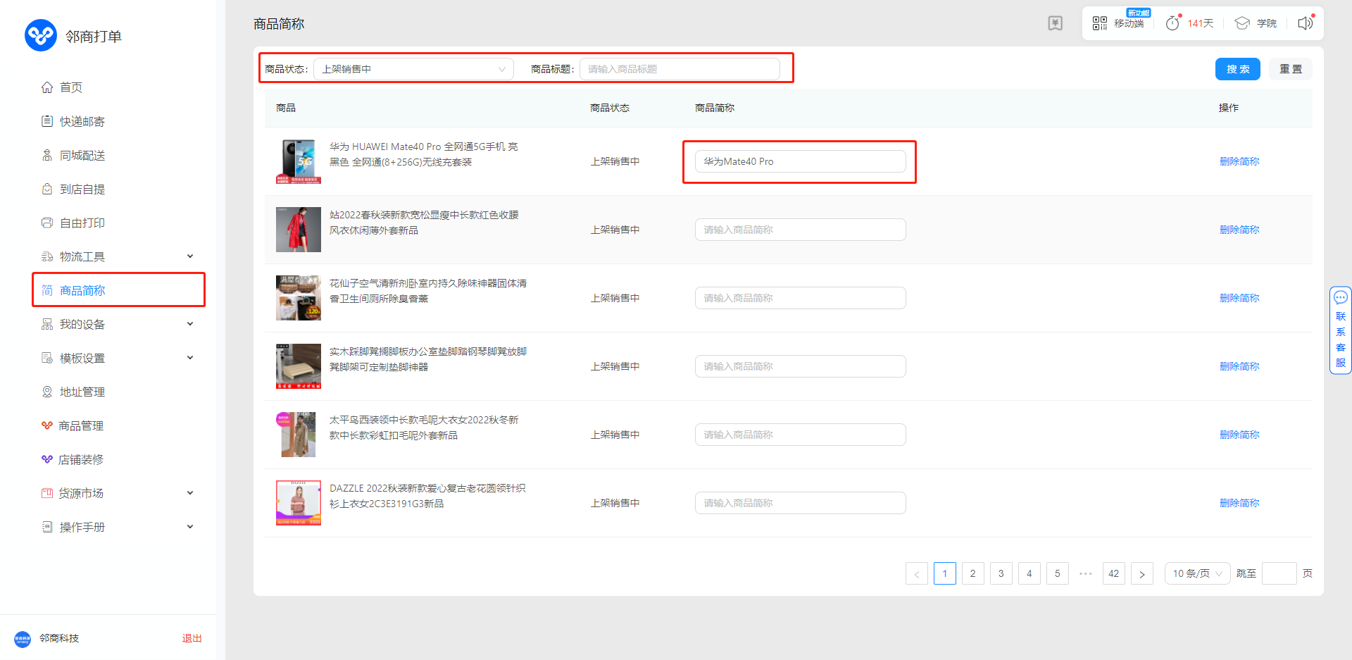 当商品名称较长时,可以选择设置商品简称进行打印操作。点击【商品简称】,选择商品状态或者使用商品标题进行搜索,然后在【商品简称】栏输入商品简称即可,后续打印时开启简称打印,即可使用简称进行打印