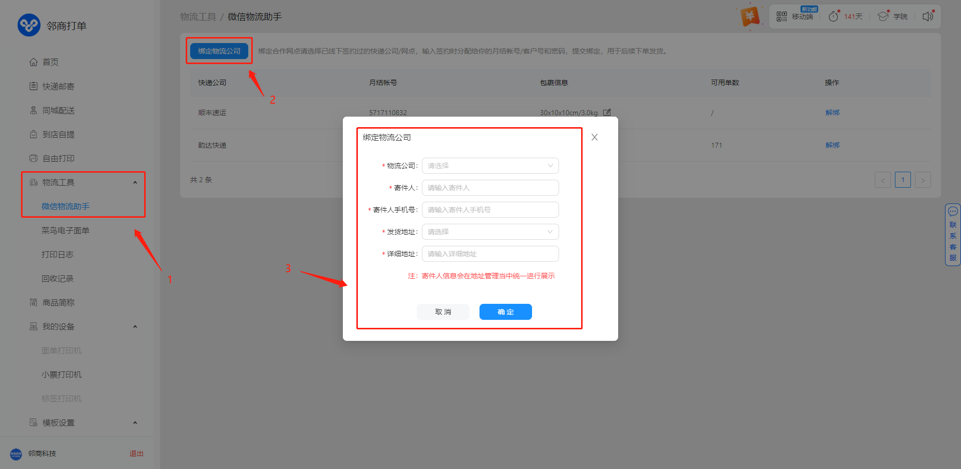 点击左侧【物流工具】,如您开通了微信物流账号,则点击【微信物流助手】,填写相关账号信息进行绑定