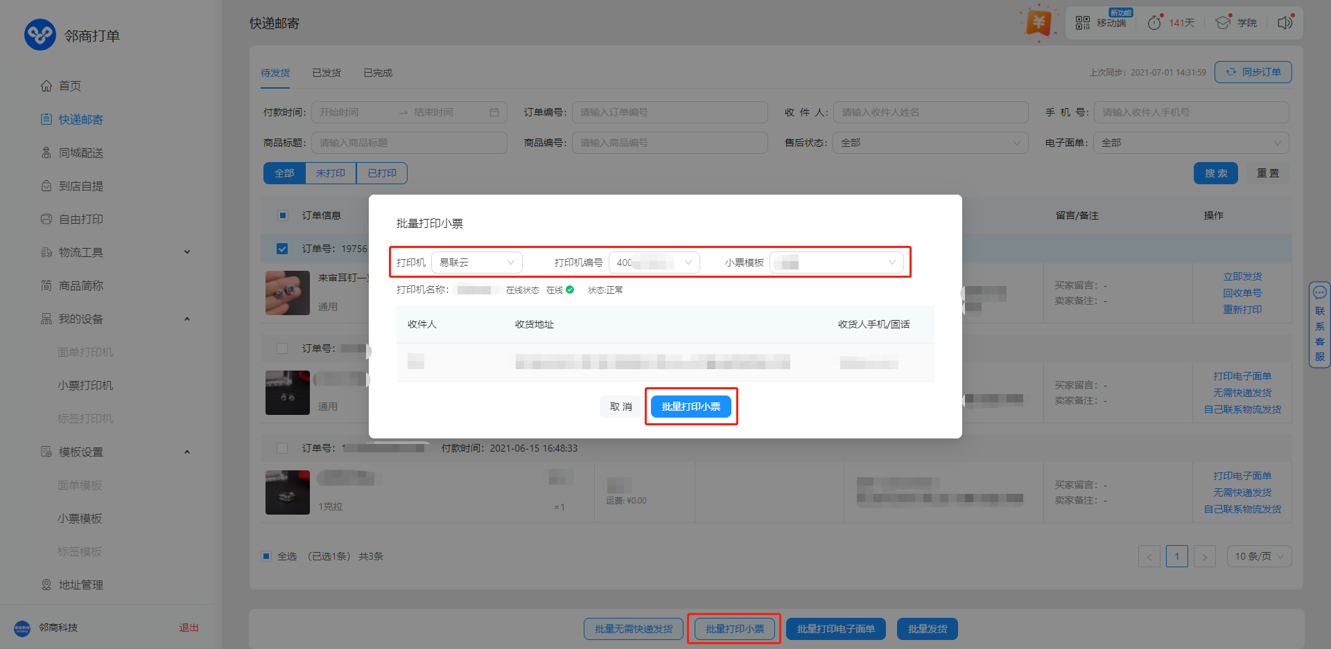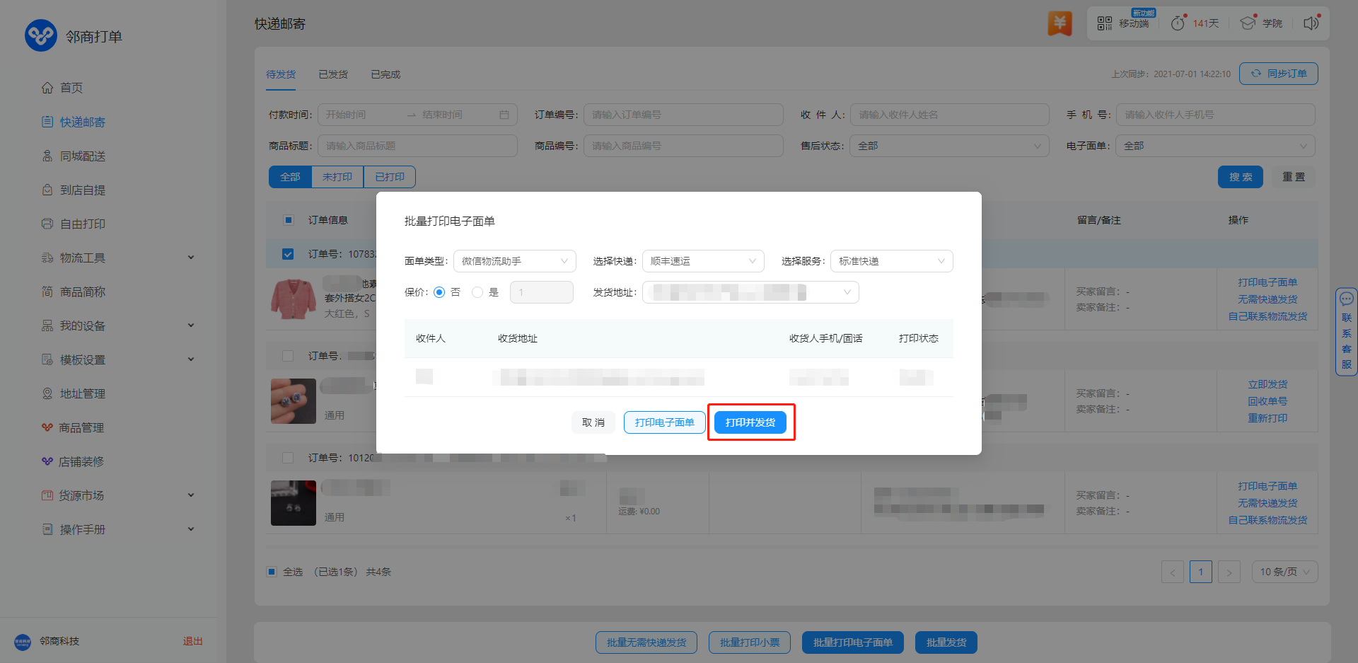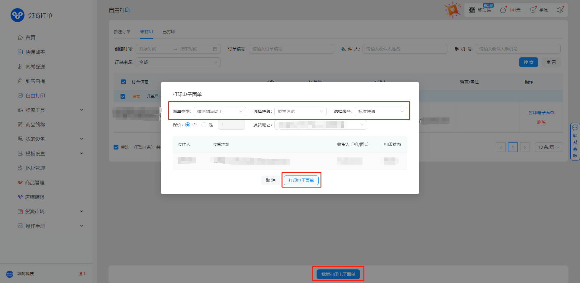 勾选待打印订单,点击【打印电子面单】或【批量打印电子面单】,选择面单及快递