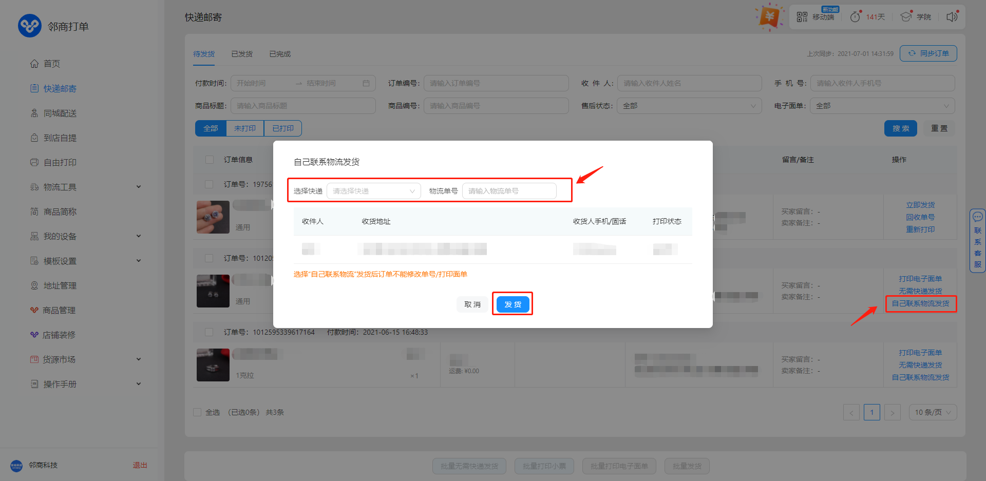 如您自己联系物流发货,您可以点击订单右侧【自己联系物流发货】,输入物流信息,即可发货