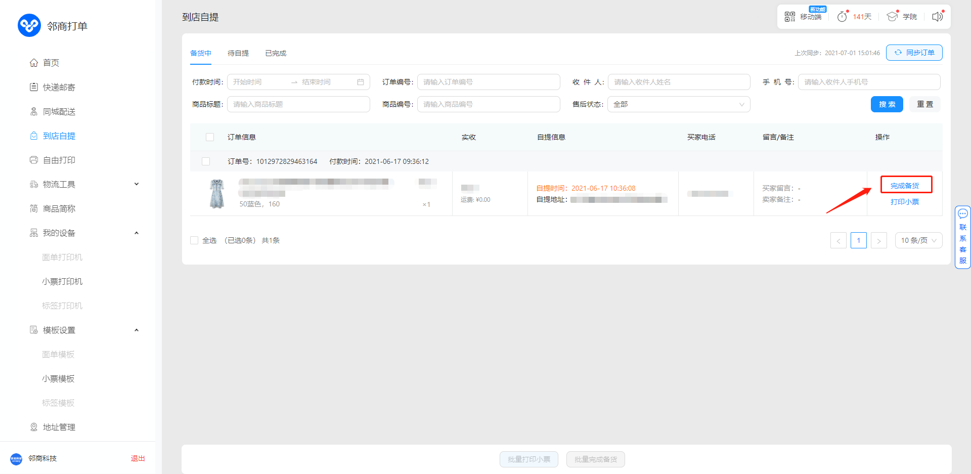 到店自提订单支持【完成备货】和【打印小票】功能。