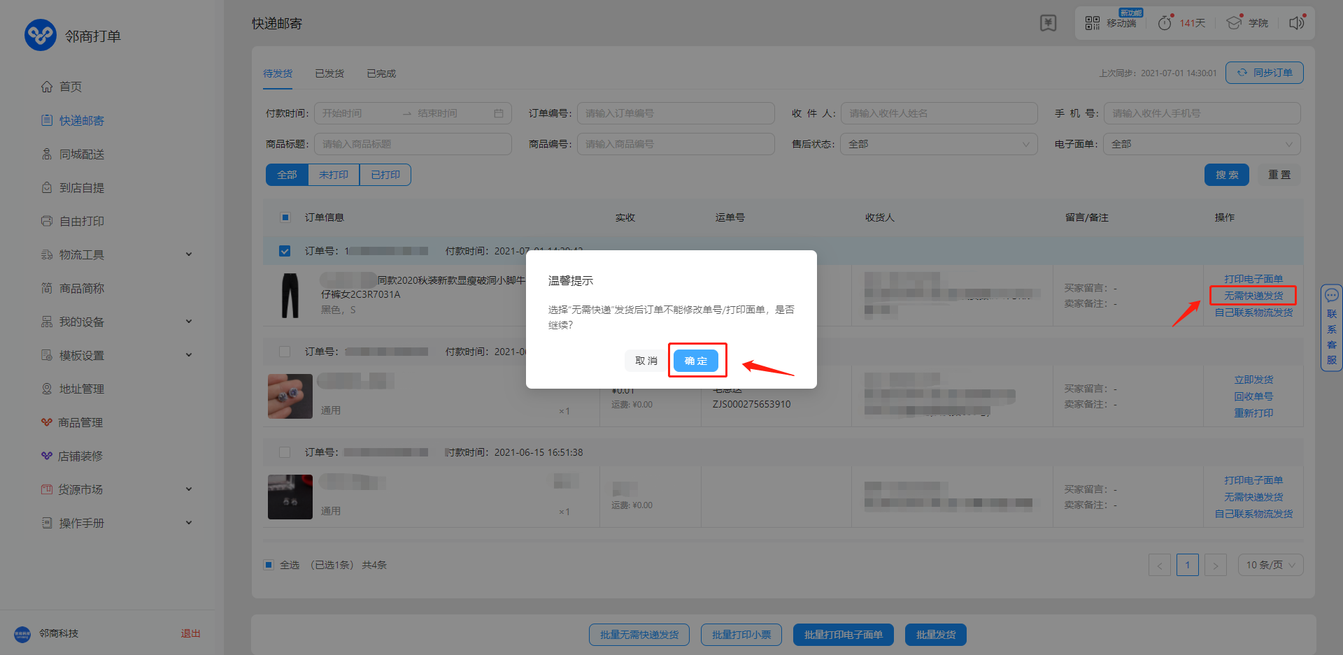 打印完成后关闭预览页面,可以根据打印效果选择【重新打印】或【打印成功】,打印成功后待发货列表即可看到运单号,确认后勾选订单,点击【立即发货】或【批量发货】,即可进行发货操作,同步该物流信息到小商店后台。