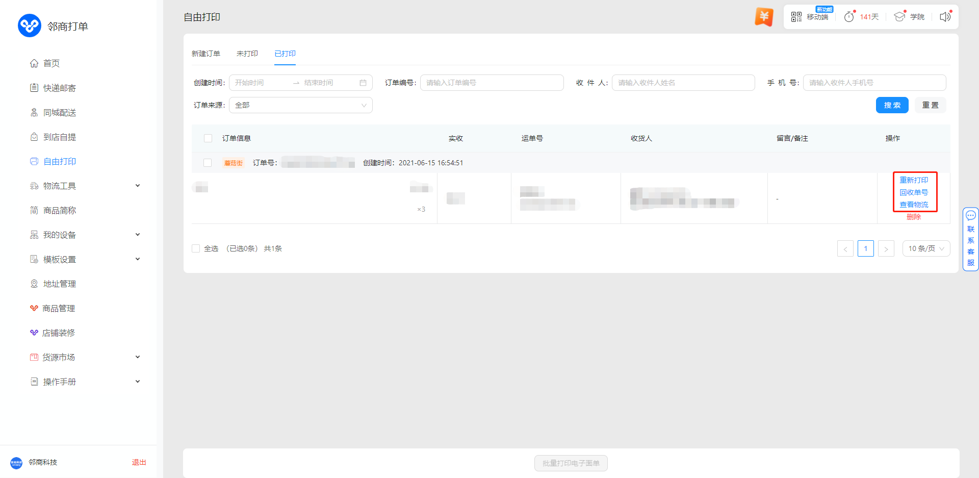 已打印的订单可以在已打印列表中进行【重新打印】、【回收单号】、【查看物流】操作