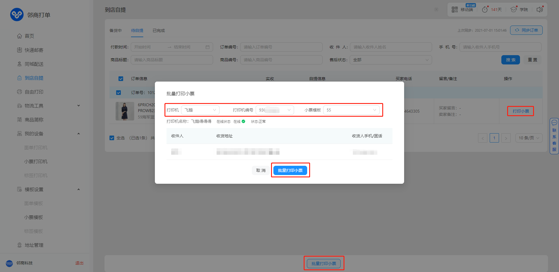 勾选待打印订单,点击【批量打印小票】,选择打印机及小票模板(如果设置了默认,则会显示默认打印机和打印模板),点击【批量打印小票】,即可成功打印
