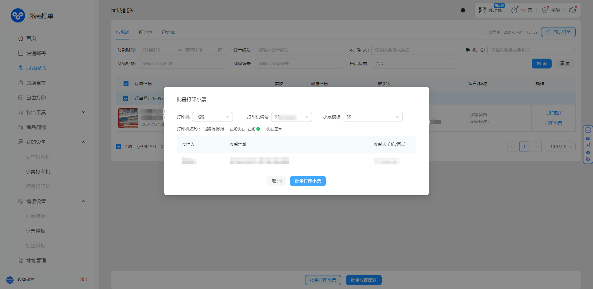 勾选待配送订单,点击【打印小票】或者【批量打印小票】,选择打印机及小票模板(如果设置了默认,则会显示默认打印机和打印模板),点击【批量打印小票】,即可成功打印小票
