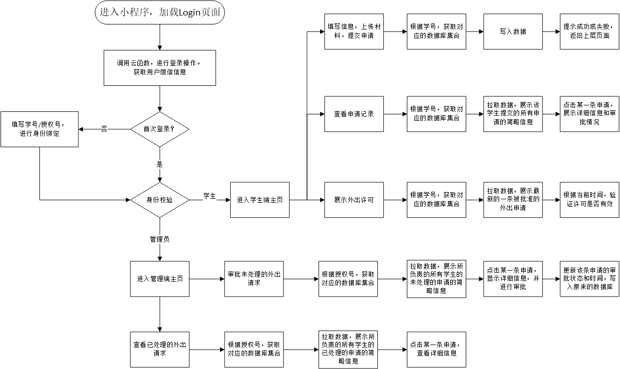基于以上原因,作者使用云开发+微信小程序开发了本项目,在参赛之余,也将联系学校将该小程序上线使用,简化外出审批流程,方便同学们外出,同时减轻纸质申请审批流程给辅导员及学校行政管理人员带来的不必要的工作负担。
