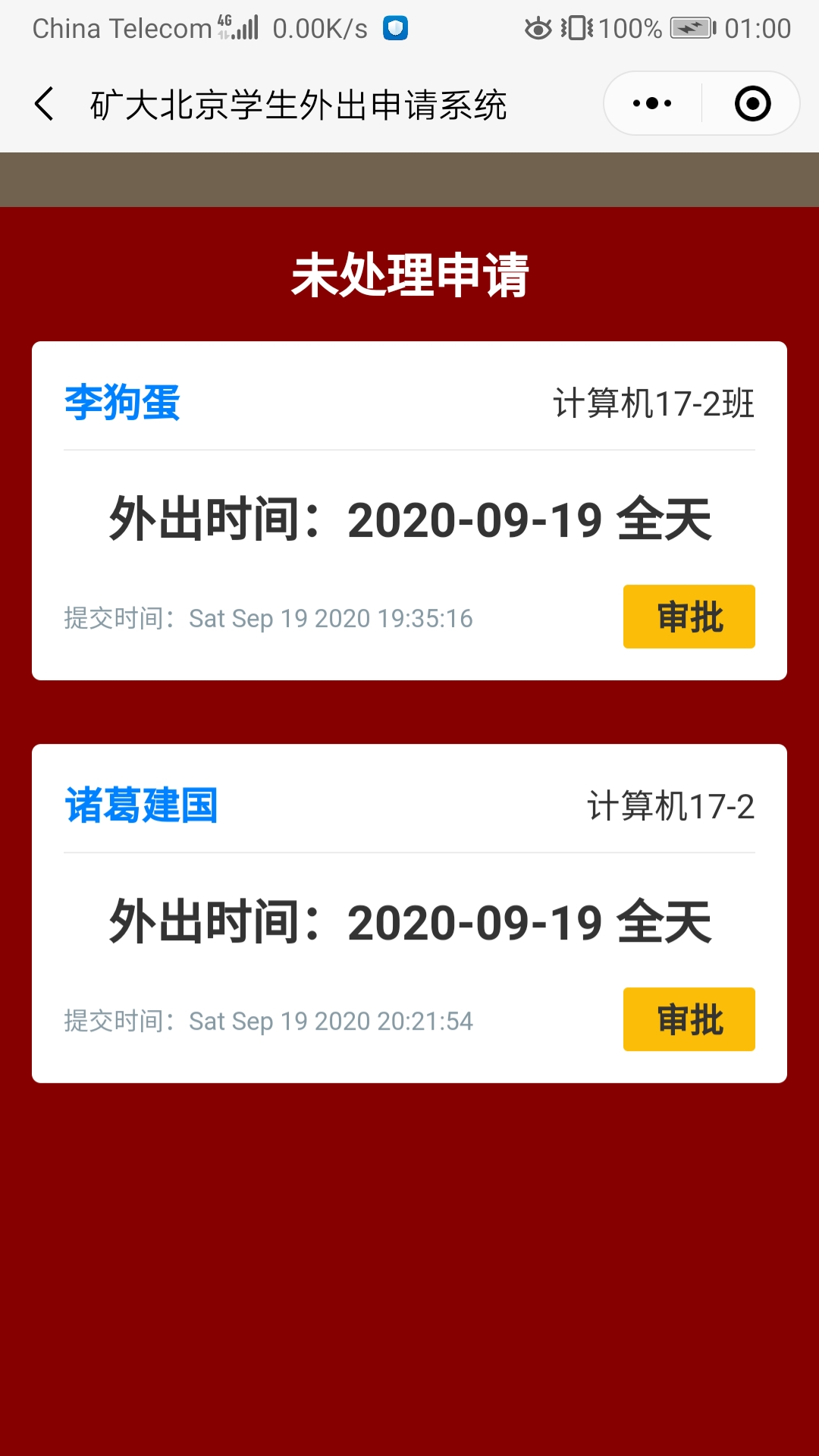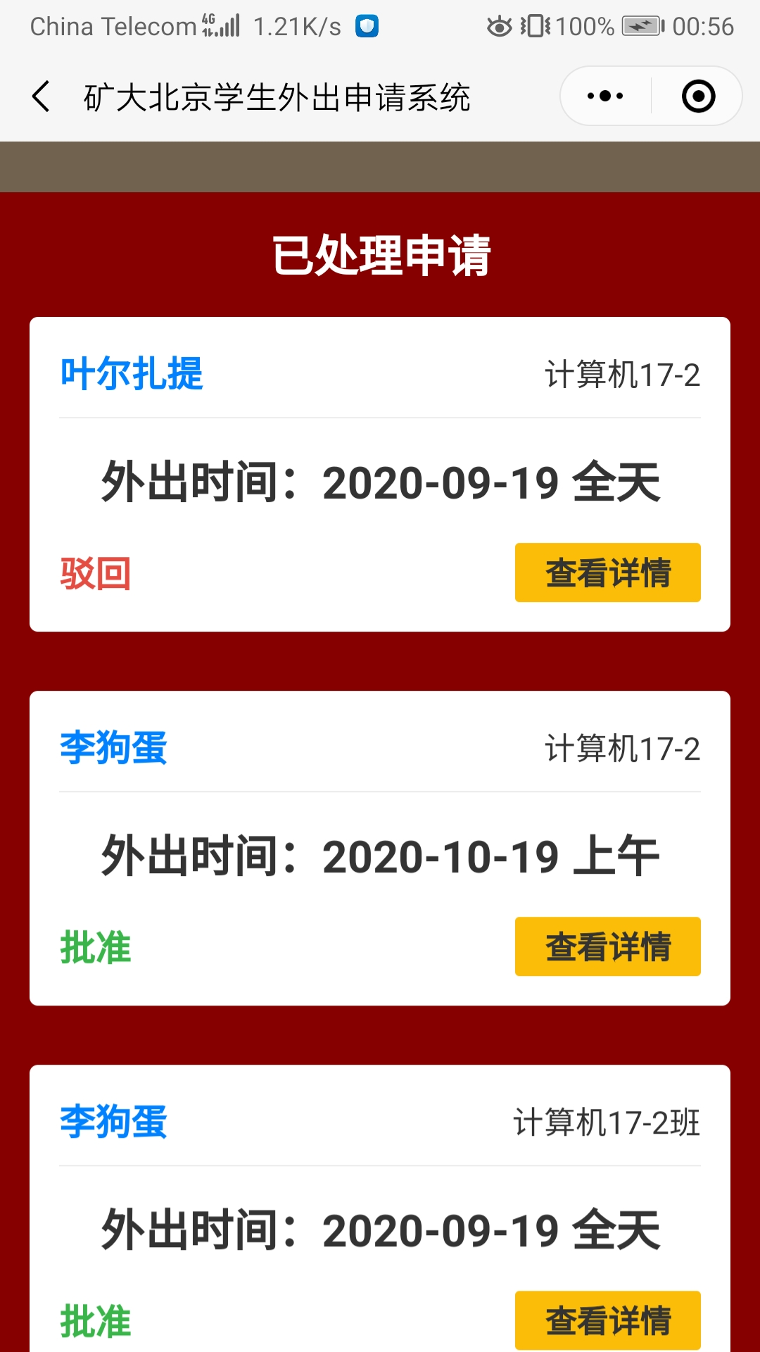 管理端会根据辅导员授权号,从对应的数据库中,拉取出该辅导员分管的某学院某一年级的所有学生提交的申请,审批后,重新写入该数据库。