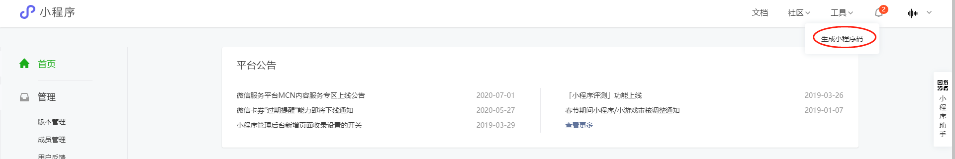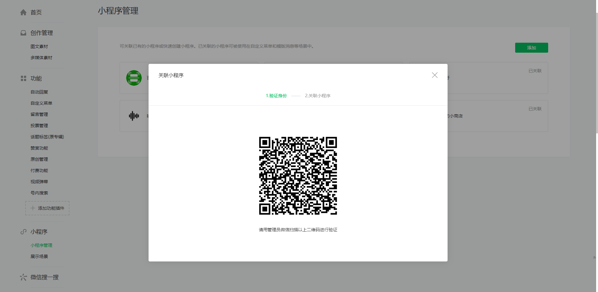 1.左边找到小程序管理点击,右上角点击添加,需要管理员扫码