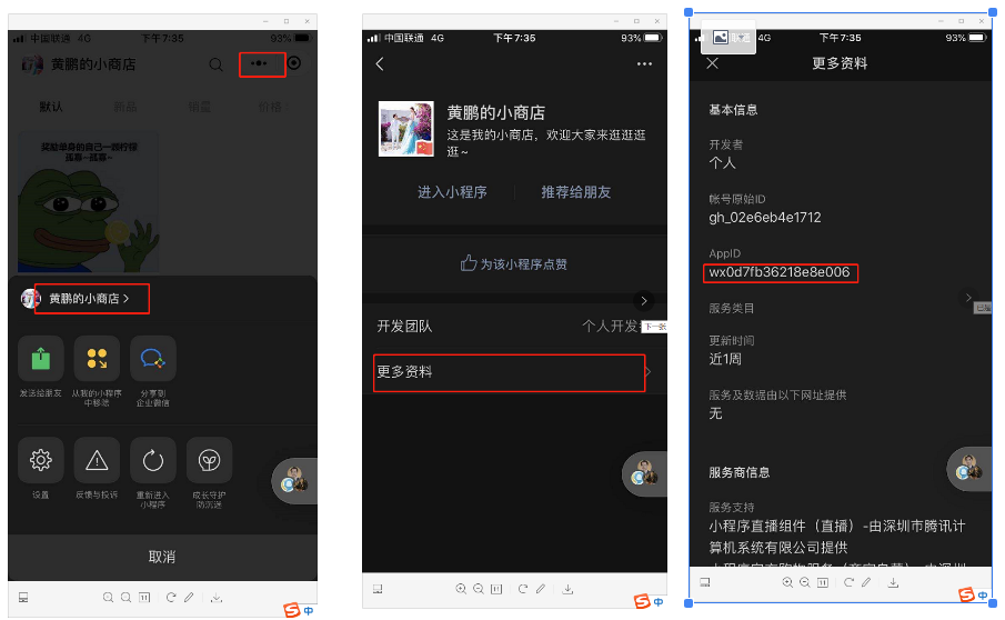 1.微信中打开小商店,依次点击-【右上角三点】-【小商店名称】-【更多资料】-长按复制AppID