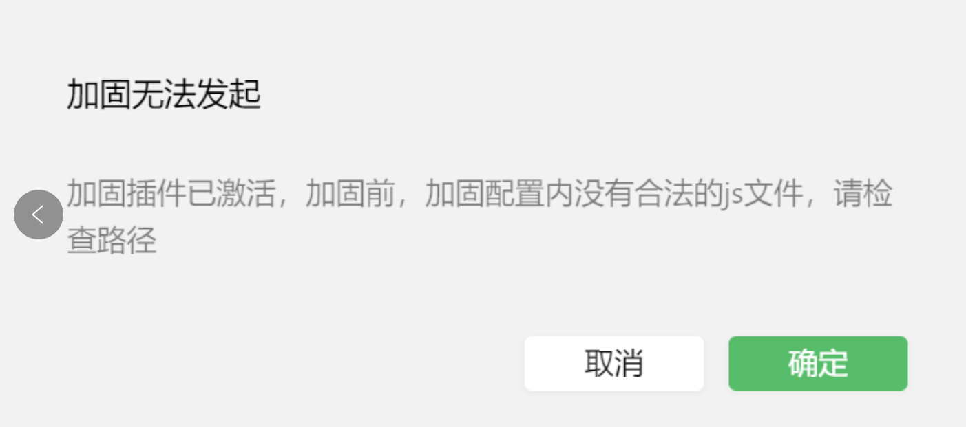 最近,微信开发工具的代码加固秃然用不了了。每次预览时都会提示 加固插件已激活,加固前,加固配置内没有合法的js文件,请检查路径