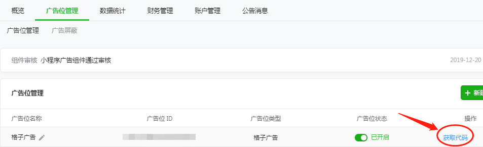 在广告位管理广告列表处,点击获取代码,然后复制代码即可。