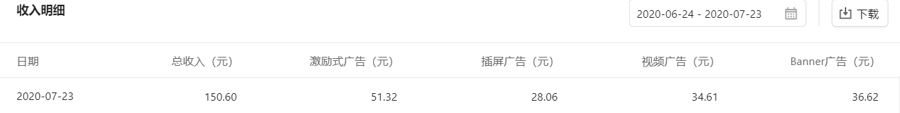 上线第一天的流量主收益,每天达到了150元