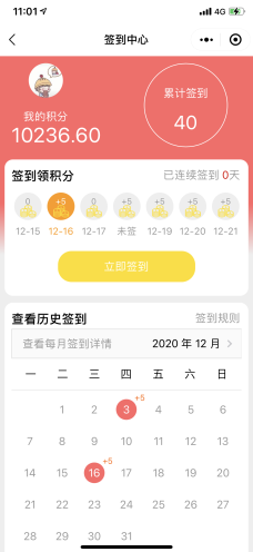 简单提下思路,首先默认确定当前年月,cy cm, 初始化:获取days遍历日历的格子,通过获取当前月第一天是星期几来判断前面有几个空格,放入days,再当月天数放入days,然后进行渲染,再通接口去拿签到信息,签到成功的突出显示。这里签到初始化时我默认给了标识isSign,将已签到列表和当前年月日进行比较,符合条件则更新签到状态。切换选择日期,这里我用的是选择器,当然可以写成点击左侧按钮上一月,右侧按钮下一月那种,重新选择日期后,initdata(e) 传入年月,就是当前选择年月的数据。将星期日作为第一日的我也备注上去了。样式根据自己的喜好改就行了,最后看看我写的两个项目效果: