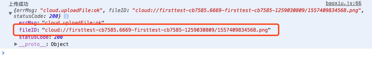 - 在上传成功后,会有如下回调。下图中的filenId就是我们在云存储中的路径,可以直接用这个路径来获取图片并显示的。
