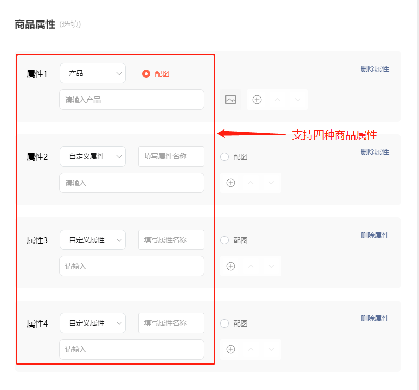 其一,商品编辑页面中,原来的【销售属性】变成【商品属性】板块,由原来的两种属性拓展成现在的四种属性,商品规格数量翻倍了,商家上架商品规格不再受限。