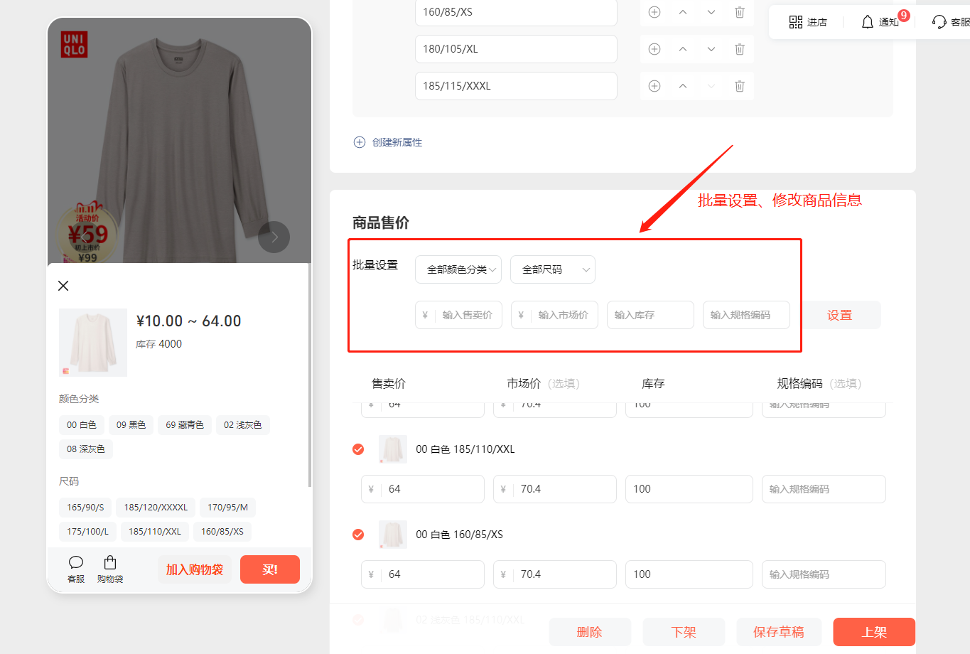 其二,【商品售价】中新增批量设置功能,在上架商品时,商家可通过筛选商品属性,批量设置商品的售价、市场价、库存以及商品规格编码。该功能的上线,对于极大提高了上架商品的效率。
