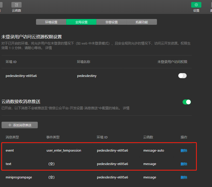 云函数--设置--全局设置,打开云函数接收消息推送,如下图绑定: