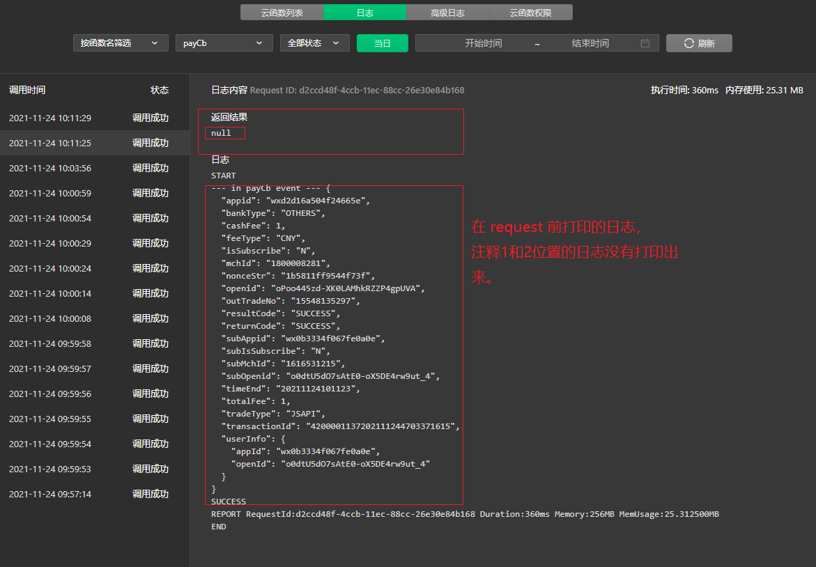 exports.main = async (event, context) => { // 更新数据库 await request({ url: 'http://xxxxxxxxxxxxxxxxxxx.com', // 我们自己的服务 method: 'POST', data: { ...event, }, success: (res) => { console.log('更新成功') /* 2 */ if (res && parseInt(res.statusCode) === 200) { return { errcode: 0, errmsg: 'SUCCESS' } } else { return { errcode: 1, errmsg: 'FAIL' } } }, fail: (res) => { console.log('更新失败') /* 2 */ return { errcode: 1, errmsg: 'FAIL' } }, }) }请教大佬,这种写法中,注释 1 和 2 处观察不到代码执行(使用云函数本地调试打断点也不会进入回调),微信也得不到这两个回调中 return 的对象——是这种写法有问题吗?还是说并没有必要这样写,直接判断一下 returnCode 和 resultCode 均为 SUCCESS 就可以放心的返回 { errcode: 0 } 了?