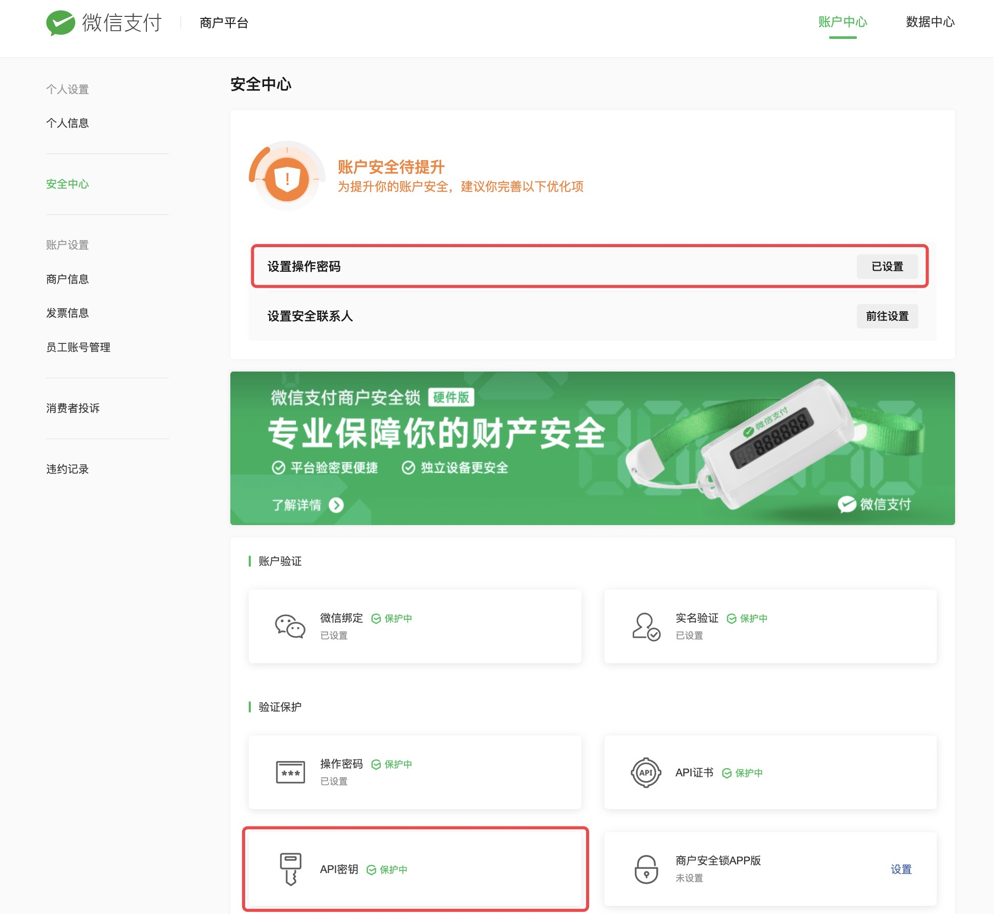 - 注意:配置API密钥之前需要先在「安全中心」页面顶部的「设置操作密码」位置设置6位数数字的操作密码